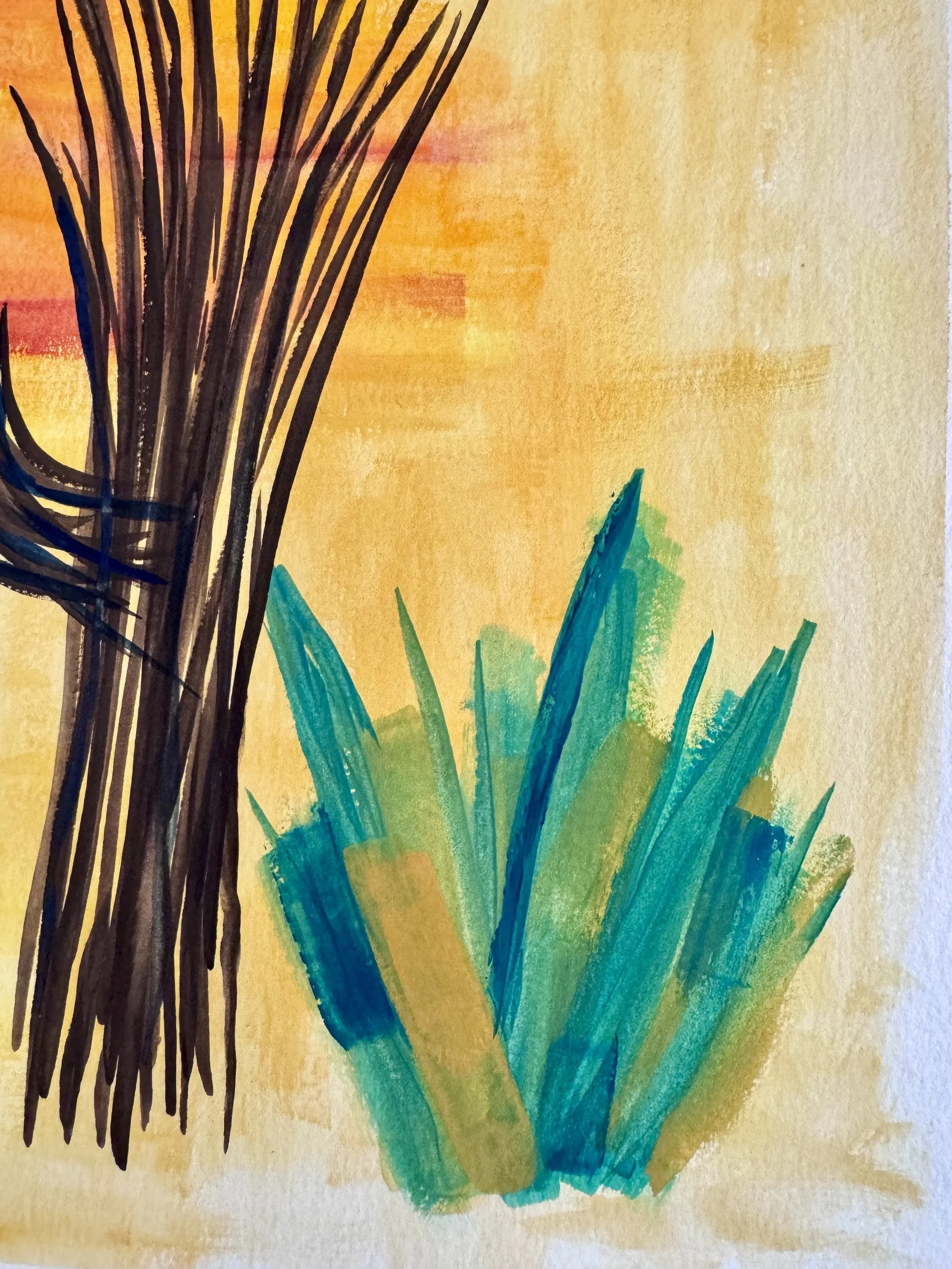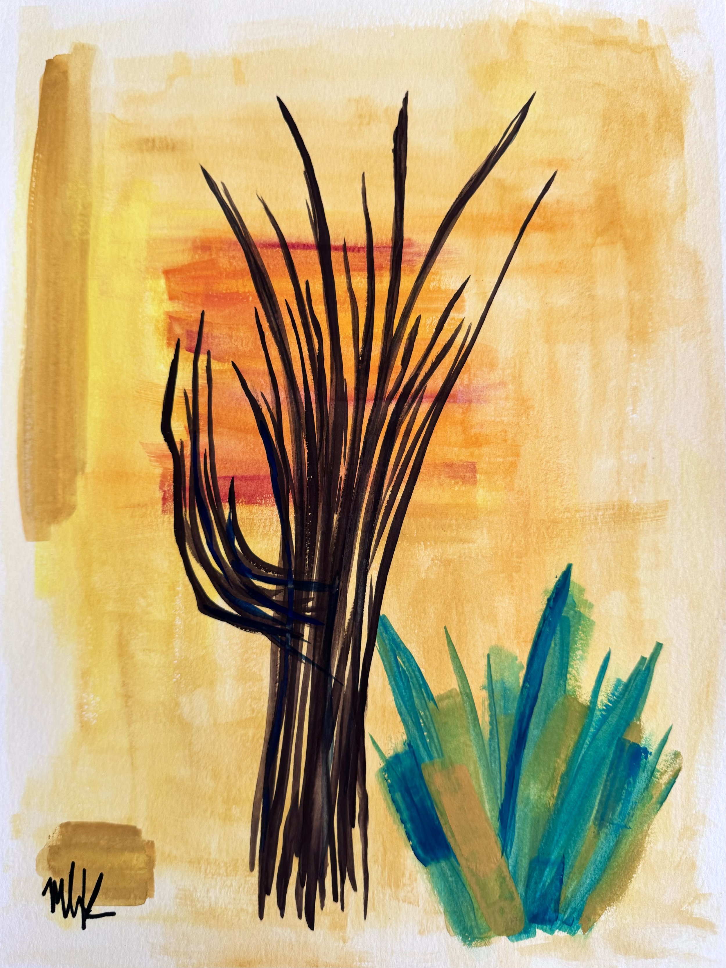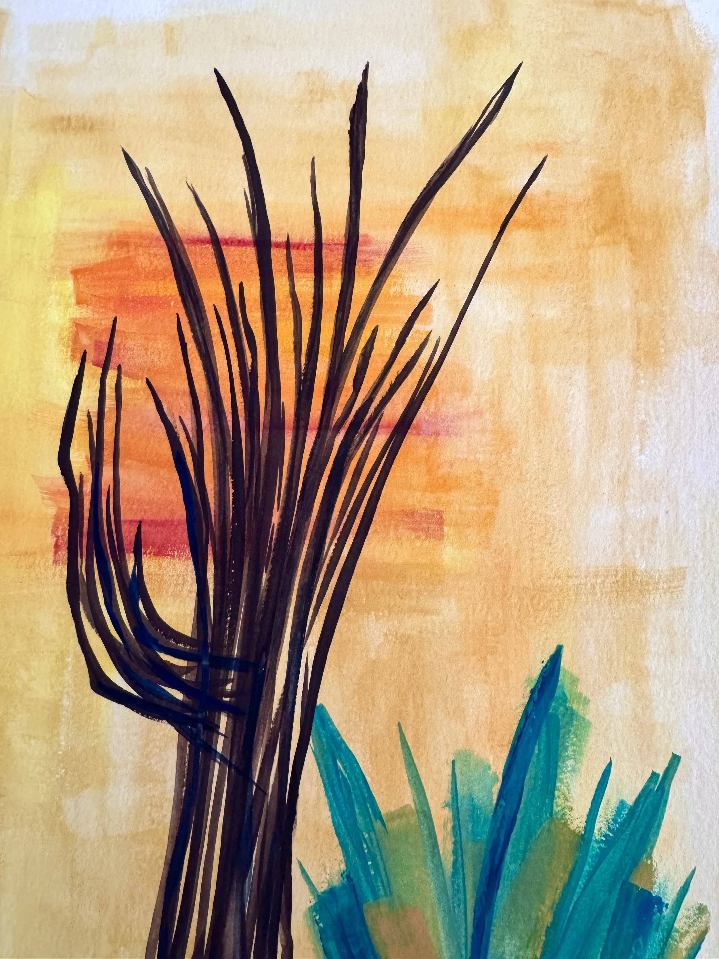 This is the third painting in the series ‘Ribs.’ Bold brush strokes and a minimalist color way provide a background for statuesque saguaro ribs. Though saguaros tend to live hundreds of years, once they perish, they leave behind a bizarrely beautiful skeleton that holds the place where they once thrived; an eerie ghost of what they used to be.