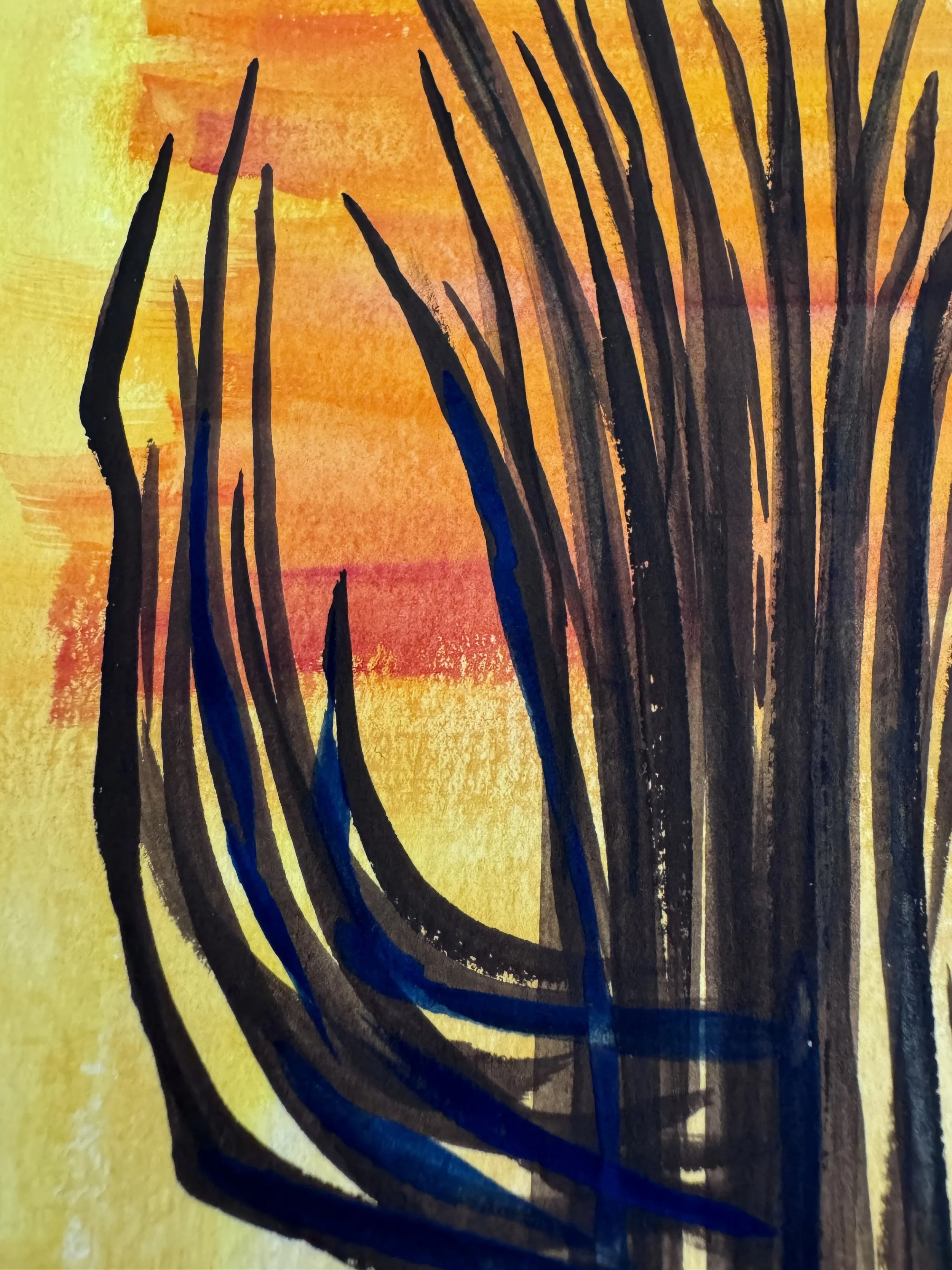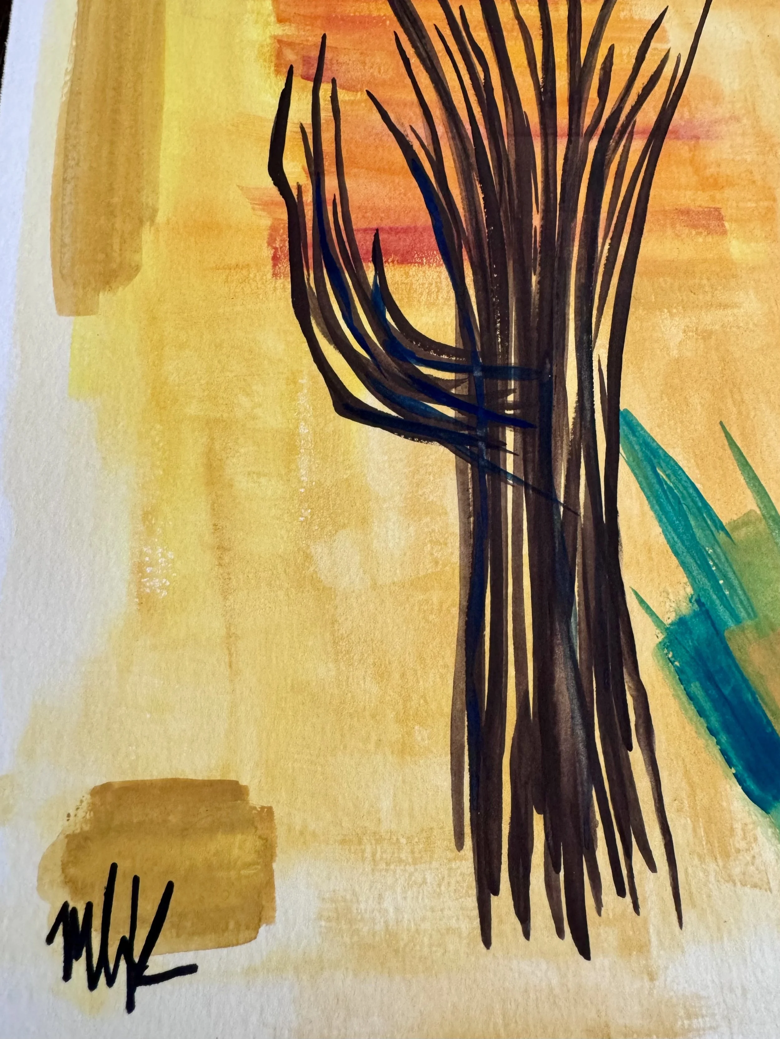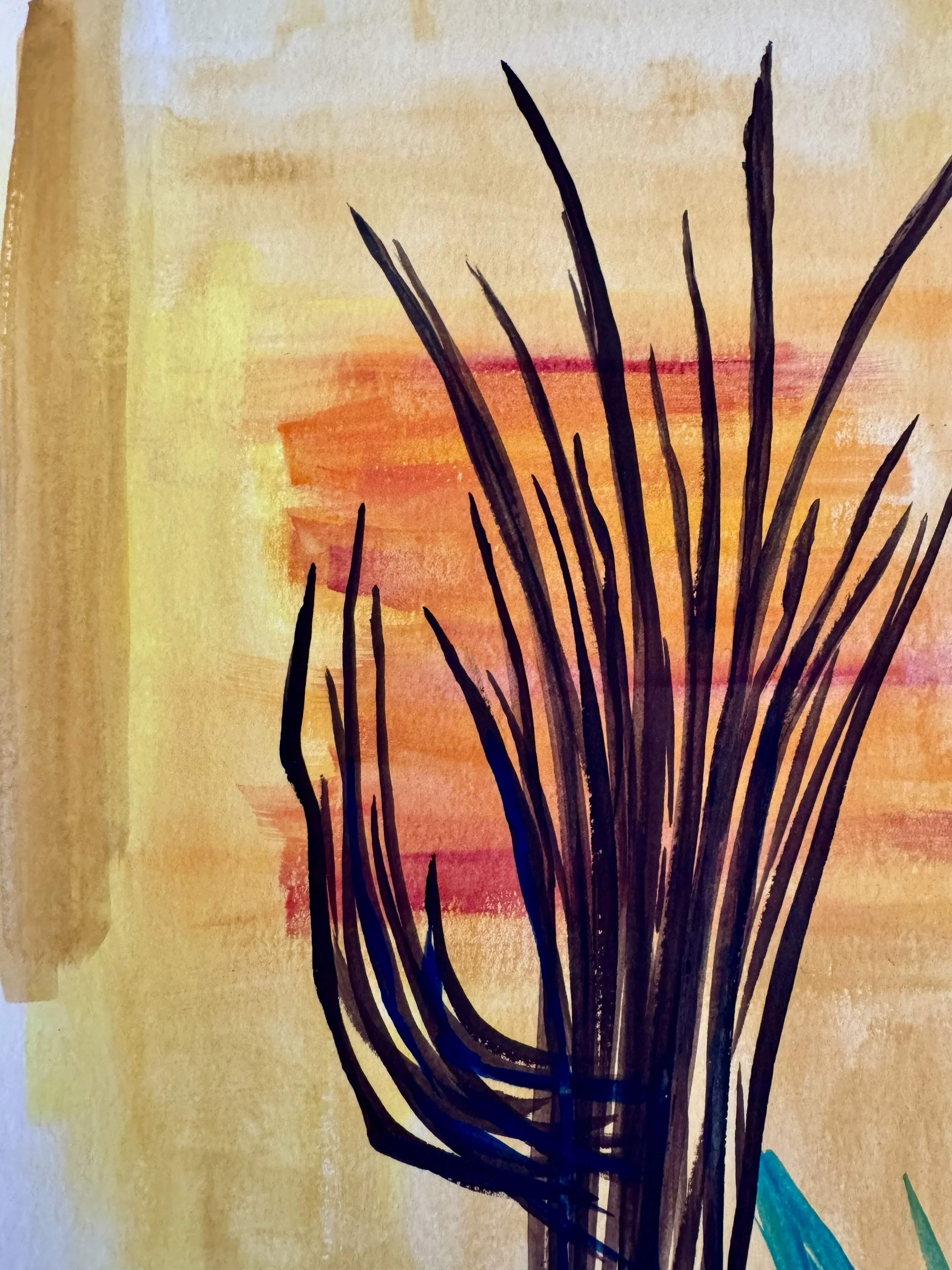 This is the third painting in the series ‘Ribs.’ Bold brush strokes and a minimalist color way provide a background for statuesque saguaro ribs. Though saguaros tend to live hundreds of years, once they perish, they leave behind a bizarrely beautiful skeleton that holds the place where they once thrived; an eerie ghost of what they used to be.